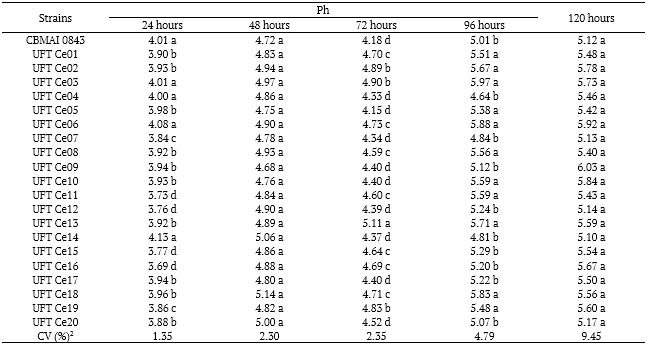 The pH of the cultivation medium, initially at 4.5, showed a decrease in 24 hours in all isolates (Table 5). Such a decrease is characterized as the exponential phase of fungal growth due to the high metabolic exchange that causes cell ions to release and pyruvic acid to form from the glucose present in the culture medium. Then, the ‘lag’ phase begins with approximately constant pH values. Finally, the pH tends to neutralize, reaching its highest values, possibly due to the decrease in metabolic activities in the end of the cultivation time (Stamford et al., 2007).
