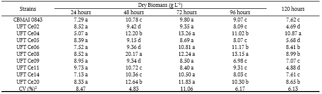 The isolated strains showed good mycelial growth, with emphasis to the isolate UFT-Ce08, which presented the highest value of dry biomass.