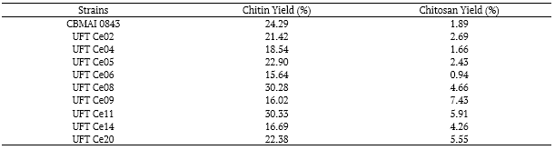 The yields of chitin and chitosan showed values close to those found in the literature, with the highest amount of chitin and chitosan for the isolates UFT-Ce11 and UFT-Ce09, respectively.