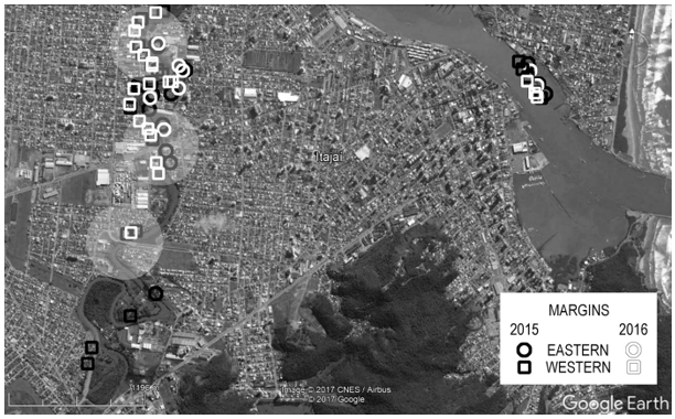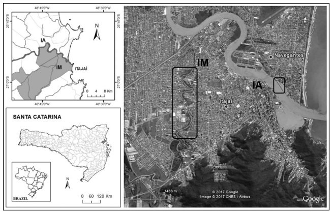 The municipality of Itajaí (26°54'06” S, 48°39’40” W. Figure 1), located on the north-central coast of Santa Catarina, BR, presents a mesothermal humid climate of 21°C (Köppen classification), relative humidity of 80%, and rainfall from winter to summer (Schettini, 2002; Silva & Severo, 2018). Itajaí has around 100 km² of an urban area (Santa Catarina, 2016), where the final portions of the rivers Itajaí-Mirim (from now referred to as IM) and Itajaí-Açú (IA) are located. One of IA’s margins belongs to the municipality of Navegantes.