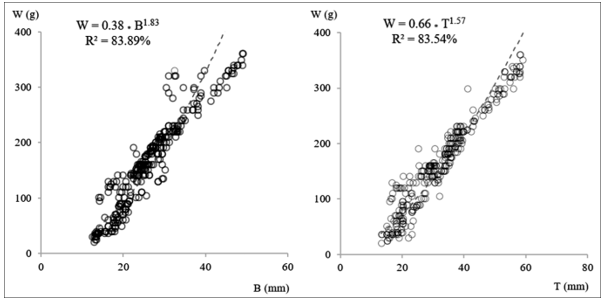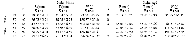 Eggs showed coloration ranging from green to light blue and were laid asynchronously, and were always found dirty with mud. The mean values and standard deviations of their dimensions presented some variations between rivers and years (Table 5). Comparing seasons in the IM, eggs were heavier in 2015 (U = 6726.50, p < 0.05) and longer in 2016 (t = 2.15, df = 283, p < 0.05); while in the IA, length, width, and weight were higher in 2016 (t = 2.32, df = 57, p < 0.05; t = 7.66, df = 57, p < 0.05; U = 60.50, p < 0.05). Between rivers in 2015, width and weight were higher in the IM (t = 5.42, df = 95, p < 0.05; U = 71.50, p < 0.05).