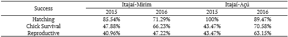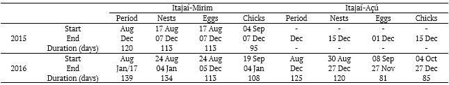 Considering the numbers discussed above, as well as lost eggs and reused nests here in this study, variations between rivers indicate a better situation in the IM than in the IA for the second season. The differences in the number of lost eggs for the IM between the two seasons also point to a better condition for the population in 2016. This circumstance may indicate the participation of new reproductive individuals from the season before or coming from other populations in the region, as the colony increased between years (Branco, 2003; Efe, 2004). Also, the rivers may be influenced by different aspects in their proximity, with possibly lower negative impacts in the second year. Availability of food resources and vegetation for nest installation, and the influence of predation, floods, and anthropic impacts need to be better assessed in the future through monitoring these and other breeding populations (Branco, 2003; Kushlan & Hancock, 2005; Kelly, Stralberg, Etienne & McCaustland, 2008). For example, the small number of nests in the IA may be related to disturbances caused by port undertakings carried out in the region during the period, which can increase the daily pressure on the area (Schettini, 2002, 2008).
