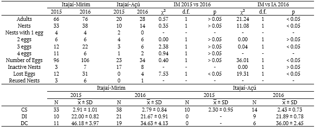 Numbers from seasons and comparisons between rivers and years determine the breeding cycle in the region in the research period (Table 2). Between seasons in the IM, the number of lost eggs was higher in 2016 (Table 2). Numbers were significantly higher in the IM than in the IA in 2016, except for nests with two eggs and inactive ones, which did not vary. Nest reuses occurred within a season (Table 2), but it was not possible to confirm couple fidelity. However, some reutilizations happened during late parental care, which suggests the persistence of the same couple. Ten nest sites from 2015 were reused in 2016, even though nests totally or almost vanished between seasons.