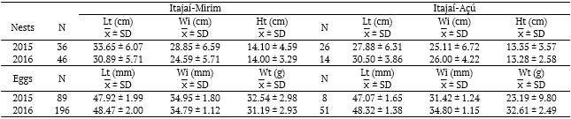 Nests were built in a basket shape, using leaves and other flexible items in the center and resistant sticks in the periphery, sometimes with thorns. The means and standard deviations of the dimensions had few variations between rivers and years (Table 5). Comparing rivers, the length and width of the nests were higher in the IM in 2015 (t = 3.63, df = 60, p < 0.05; t = 2.18, df = 60, p < 0.05), as well as the width between breeding seasons (U = 403.50, p < 0.05).