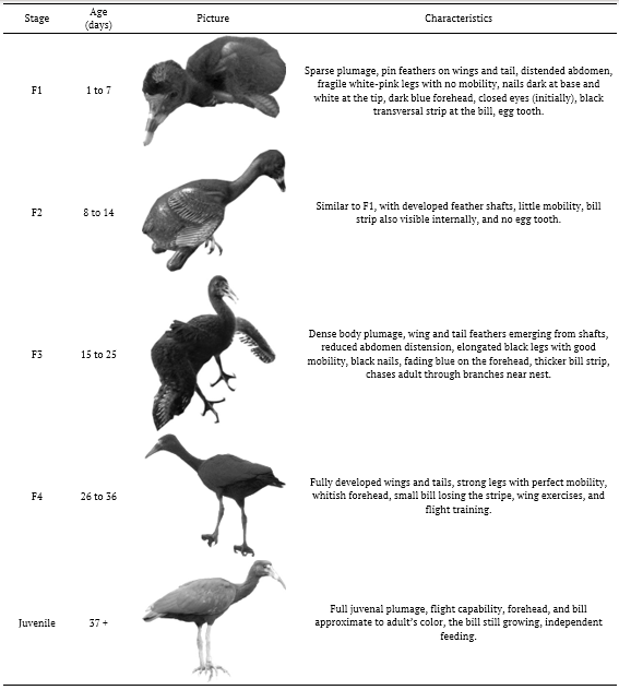 Abstract: The Bare-faced Ibis is a gregarious bird found in South America. In the face of a rapid expansion in a southern state in Brazil and a lack of detailed information about the species' reproduction, two breeding areas were studied weekly for two consecutive seasons. We registered numbers and characteristics of adults, nests, eggs, and chicks, calculated success estimates, and assessed nest installation preferences. Chick morphology, age, and measurements served to define five growth stages. The species used the margins of two close rivers in Santa Catarina to build nests, lay eggs, and develop parental care between August and January, with success estimates as expected for the family. We observed a preference for the eastern margin of the rivers and proximity to bridges for nest installation, where the muddy margin provides resources for juvenile feeding. Two colony models were defined based on the near or far installation of the nests. Variations in egg and chick dimensions indicated higher adult investment in the second season, with negative allometric growth of the bill and tarsus of chicks related to weight. The results presented suggest favorable conditions for the species’ reproduction in the region, a considerable factor in understanding its expansion in recent years.