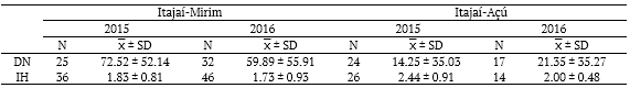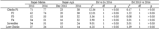 The number of chicks gradually decreased between stages (Table 7). Comparisons of quantities between rivers presented differences (Table 7). In 2016, all values were higher in the IM, but no variation was found between seasons for the river.