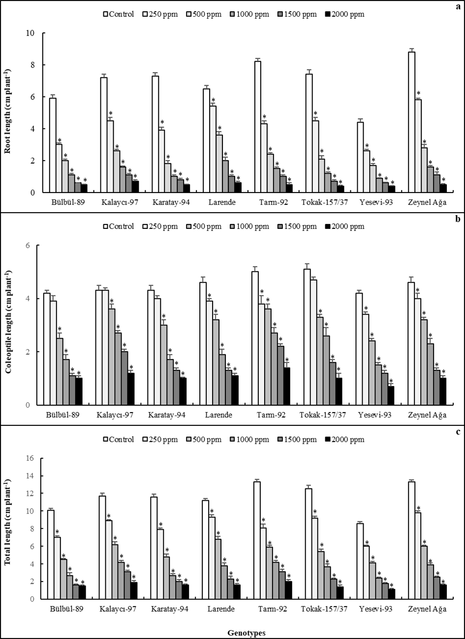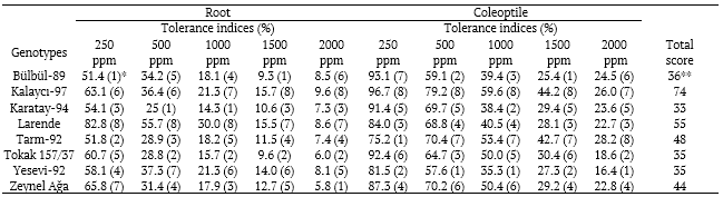 According to the tolerance indices (TI) calculated on the basis of root length, the genotype Karatay-94 had the lowest score (11) among all barley genotypes used in our study (Table 1). As for TI calculated on the basis of coleoptile length, the lowest score (7) was observed in the genotype Yesevi-93. On the contrary, the genotype Larende represented the highest score of the root TI (38), whereas the highest score of the coleoptile TI (39) was observed in the genotype Kalaycı-97. According to the total TI, however, the genotypes Kalaycı-97 and Karatay-94 had the scores 74 and 33, respectively.
