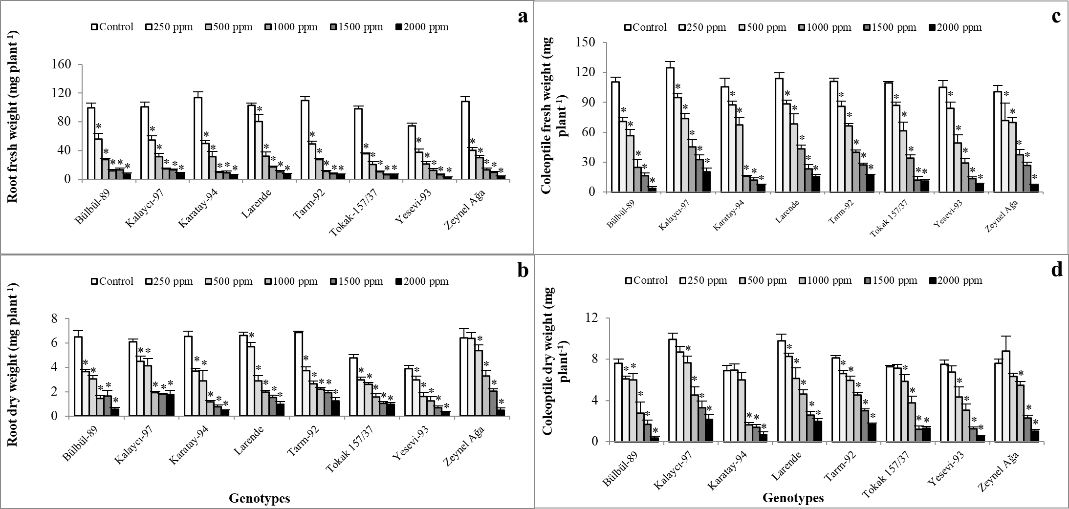 The coleoptile fresh weight of the genotypes Karatay-94 and Bülbül-89 was significantly decreased by 17% and 36% in response to 250 ppm nickel application, respectively (Figure 2c). 500 ppm nickel treatment led to a 31% decrease in the genotype Zeynel Ağa and a 53% decrease in the genotype Yesevi-93 compared to the respective controls (Figure 2c). At 1000 ppm nickel concentration, the genotype Larende showed 62%, and the genotype Karatay-94 showed 75% decline in coleoptile fresh weight, respectively. 1500 ppm nickel toxicity led to a 73% decrease in the coleoptile fresh weight in the genotype Zeynel Ağa as compared to control. Similarly, the coleoptile fresh weight of Karatay-94 was 88% lower than the respective control (Figure 2c). In the genotypes Kalaycı-97 and Zeynel Ağa, the fresh weight of coleoptile was declined, with a reduction of 84% and 93%, respectively. Compared to respective controls, 250 and 500 ppm nickel treatments led to 8% and 14% decreased coleoptile dry weight in the genotype Tokak-157/37 (Figure 2d). The dry weight of coleoptile in the genotype Zeynel Ağa decreased by 28% in response to 1000 ppm nickel application (Figure 2d). Similarly, the same nickel concentration led to 72% lower coleoptile dry weight in the genotype Karatay-94 as compared to control. At 1500 ppm nickel concentration, the genotype Tarm-92 showed a 63% decrease and the genotype Yesevi-93 showed a 83% decrease in the dry weight of coleoptile in comparison with control (Figure 2d). The dry weight of coleoptile in the genotype Tarm-92 was declined by 2000 ppm nickel concentration by 72%, and it was decreased in the genotype Yesevi-93 by 84% as compared to the respective controls (Figure 2d).