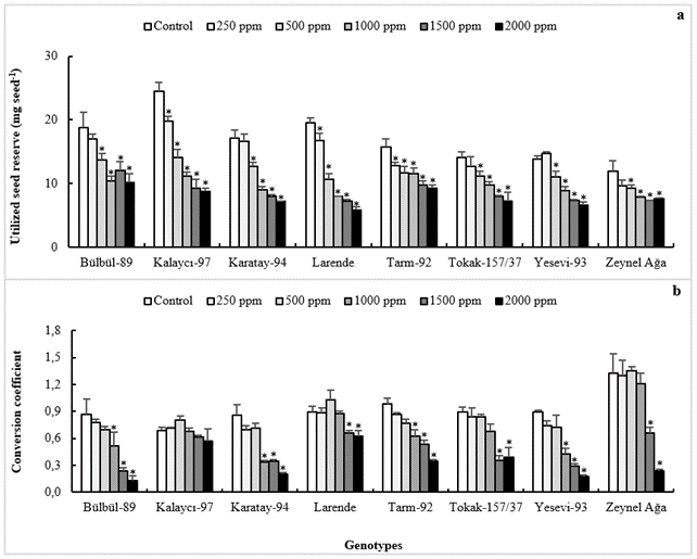 250 ppm nickel treatment did not significantly affect the amount of utilized seed reserve in the genotypes Bülbül-89, Karatay-94, Tokak-157/37, Yesevi-93, and Zeynel Ağa (Figure 3a). In the genotypes Kalaycı-97, Larende and Tarm-92, however, it was remarkably decreased by 250 ppm nickel application compared to controls (Figure 3a). At 500 ppm nickel concentration, the genotype Yesevi-93 showed a 20% decrease, and the genotype Larende showed 46% decrease in the utilized seed reserve content compared to the respective controls. Compared to the respective controls, the utilized seed reserve content in the genotype Larende was declined by 1000, 1500, and 2000 ppm nickel concentrations by 59, 63 and 70%, respectively. The seed reserve content in the genotype Tarm-92 decreased by 27% in response to 1000 ppm nickel concentration (Figure 3a). At 1500 ppm nickel treatment, a 35% decreased content of the utilized seed reserve was observed in the genotype of Bülbül-89 as compared to control. The genotype Zeynel Ağa represented a 37% decline in the content of the utilized seed reserve as a result of 2000 ppm nickel application compared to control (Figure 3a). The conversion efficiency of the genotypes Bülbül-89, Karatay-94, Tarm-92, and Yesevi-93 was not affected by 250, 500, and 1000 ppm nickel concentrations compared to the respective controls (Figure 3b). Similarly, the conversion efficiency in the genotypes Larende, Tokak-157/37, and Zeynel Ağa were not changed by 250, 500, 1000 and 1500 ppm nickel toxicity (Figure 3b). All nickel concentrations used in this study were found to be ineffective on the conversion efficiency in the genotype Kalaycı-97 as compared to control.