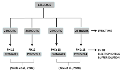 For the different study groups, the lysis solution was the same. However, the lysis time varied (2 hours or 24 hours). To detect DNA damage, for each of these times, two types of electrophoresis buffer were evaluated: one with pH 12 (Villela et al., 2007) and the other with pH ≥ 13 (Tice et al., 2000). Thus, the analyzed groups were: Protocol 1 - lysis time of 2 hours and electrophoresis buffer solution with pH 12; Protocol 2 - 24-hour lysis time and pH 12 electrophoresis buffer solution; Protocol 3 - lysis time of 2 hours and electrophoresis buffer solution with pH ≥ 13; and Protocol 4 - 24-hour lysis time and electrophoresis buffer solution with pH ≥ 13 (Figure 1).