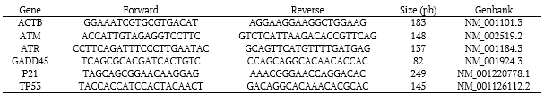 The qPCR reactions were performed in triplicates in the Rotor Gene® device (Qiagen). The analyzed genes are described in Table 1. The genes involved in the DNA damage and repair process were tested. For the reaction, it was added 10 µL of GoTaq® master mix, 2 pmol of each oligonucleotide, and 500 ng of cDNA and ribonuclease-free water q.s.p. (Promega®, catalog number A6002), totaling 20 µL. The mixture was submitted to 95ºC for 5 minutes and 40 cycles of 95ºC for 2 seconds and 60ºC for 30 seconds. At the end, the melting curve was performed to assess the specificity of the formed products. The β-actin (ACTB) gene was used as a normalizer (housekeeping), and the results were analyzed using Rotor Gene® (Qiagen) v2.3.1.