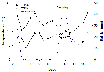Soil fauna was sampled in an afforestation of P. elliottii of 6.2 hectares and 2 x 2 meters spacing at the Universidade Federal de Santa Maria, Santa Maria, state of Rio Grande do Sul, Brazil (29º43′20′′ S, 53º42′48′′ W, 95 m). The area was planted in 1966, and since then the pine trees were never pruned or cut. The soil is classified as Gray-Brown Argisol, and the climate is Cfa Subtropical humid, according to the Köppen classification (Moreno, 1961). The average temperature reaches 18.5ºC, and the rainfall is well distributed reaching 1,580 mm per year. Values of temperature and rainfall in the period close to and during the sampling are illustrated in Figure 1. Weather data was obtained from an official station, located 530 m from the study area (Instituto Nacional de Metereologia [INMET], 2017).
