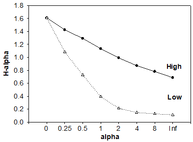 The calculated Jaccard Index was 66.7%, indicating similarity in the composition of genera and families of Collembola between high and low soil moisture areas (p = 0.23928). The Renyi diversity profiles showed that the species richness of springtails was five (alpha = 0) in both areas (Figure 3). However, the Shannon index (alpha = 1) and the Simpson index (alpha = 2) were higher in the area with high soil moisture. Moreover, this area was more even (alpha =0) and the lower proportion of dominant groups contributed to higher diversity.