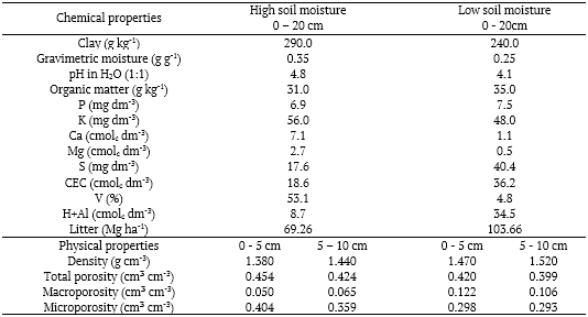 The two sampled areas showed differences regarding the soil chemical and physical properties (Table 1). The high soil moisture area stood out by the content of calcium and magnesium, respectively, 545% and 440% superior to the low soil moisture area. On the other hand, values of OM, P, S, CEC, H+Al were higher in the low moisture area. The litter, composed of needles of P. elliottii, showed a high amount of dry mass, especially in the low soil moisture area. The analysis of physical properties demonstrated that the high moisture area soil is less dense due to a higher total porosity, with a predominance of micropores.