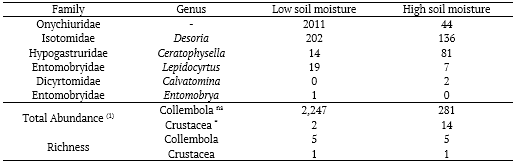 In the area with low soil moisture, it was observed only one individual of Entomobrya. Chang, Wang, Liu, Callaham Jr. and Ge (2017) observed organisms of this genus in pine forests of different ages in China (from 26 to 260 years old), and its abundance did not vary significantly between forests. However, Fujii and Takeda (2012) report that the abundance of individuals of this genus is related to soil litter, which corroborates our results, in which Entomobrya was found in the area with the highest litter accumulation. Individuals of the family Onychiuridae largely dominated the area with low soil moisture. The high abundance of individuals of this family have been reported in a pine forest of around 80 years and justified by the high amount of litter in the soil (Chang et al., 2017). This condition also favors the development of fungi colonies, which are part of the diet of fungivorous springtails of this family (Potapov, Semenina, Korotkevich, Kuznetsova, & Tiunov, 2016; Samain, Baldy, Lecareux, Fernandez, & Santonja, 2019).