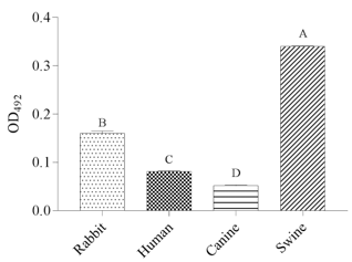 Antigenicity was evaluated by the capacity of the rErpY-like protein to be recognized by antibodies present in sera. Thus, an indirect ELISA was performed using sera from humans, swine, and canines naturally infected and positive to leptospirosis (reciprocal MAT titer >1:25,000) in pools of 5 samples, anti-Leptospira hyperimmune sera of rabbit, and normal mouse serum (as a negative control) provided by the Immunodiagnostic Laboratory of the Universidade Federal de Pelotas, Pelotas, Rio Grande do Sul, Brazil. Briefly, polystyrene plates (Polysorp, Nunc, São Paulo, Brazil) were coated with rErpY-like protein diluted in a carbonate-bicarbonate buffer, pH 9.6, at a concentration of 200 ng per well, and blocked with PBS-FBS 1%. Sera samples were diluted 1:50 in PBS-T. Then, anti-Ig peroxidase conjugates specific for human, swine, canine, and rabbit (Sigma-Aldrich, Missouri, USA), diluted as 1:10,000, 1:5,000, 1:6,000 and 1:4,000, respectively, were added. The presence of antigen-antibody complex was revealed by adding a substrate solution containing o-phenylenediamine (0.4 mg mL-1 in 0.1 M citrate buffer, pH 5.0) and 0.03% hydrogen peroxide (Sigma-Aldrich, Missouri, USA). The reaction was stopped by adding 0.1 M of sulfuric acid (Sigma-Aldrich, Missouri, USA) and the absorbance was determined at 492 nm (OD492), by using the VICTORTM X5 Multilabel Plate Reader (Perkin Elmer, Massachusetts, USA). All assay steps were performed in 100 μL well-1, at 37°C for 1 hour, and the plates were washed three times with PBS-T between the steps.