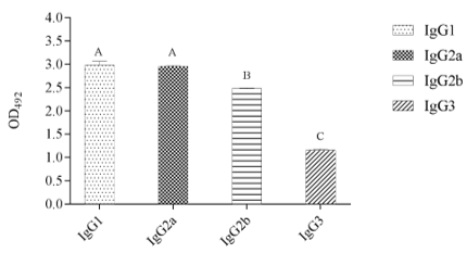The pAb against rErpY-like protein was successfully produced, purified and titrated, therefore showing a reaction with the rErpY-like protein until the dilution of 1:12,800. In the WB assay, the pAb recognized the recombinant protein in the expected size of 13 kDa. As shown in Figure 3, pAb isotyping revealed the presence of IgG1, IgG2a, IgG2b, and IgG3 subclasses. However, IgG1 and IgG2a showed a significantly higher response (p < 0.05) compared with other subclasses. At OD492nm, IgG1 and IgG2a isotypes obtained mean absorbances close to 3.0, while IgG2b obtained at approximately 2.5 and IgG3 at approximately 1.2. Thus, the isotype profile of pAb against rErpY-like protein observed was IgG1=IgG2a>IgG2b>IgG3, as demonstrated by the mean absorbances obtained in the indirect ELISA, for each subclass of IgG.