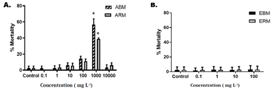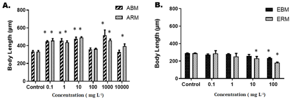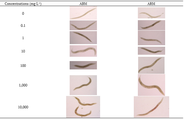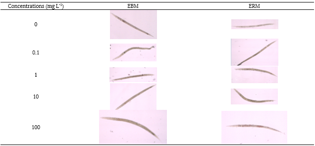 For the growth assay, L1 nematodes were exposed for 48 hours to different concentrations of EBM, ERM, ABM and ARM, with inoculation of E. coli OP50, every 24 hours. After exposure, nematodes were heated to 50°C, thus their bodies adopt a straight position. Approximately 30 nematodes per treatment were analyzed under Leica ICC50 microscope, under a 10X objective lens and body length was determined using Image J software (Yu, Zhang, & Yin, 2016; Woodruff, Johnson, & Phillips, 2019).