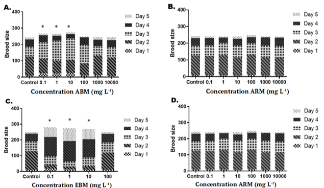 In Figure 3, the significant difference in the brood size of nematodes exposed to different concentrations of L. meyenii extracts and the control was considerable. An increase was observed in the brood size of nematodes exposed to ABM and EBM, at the lowest concentrations (0.1; 1; 10 mg L-1) mainly at 0.1 mg L-1 EBM, as illustrated in Figures 3A and 3C, while ARM and ERM showed no significant differences from the control (Figures 3B and 3D).