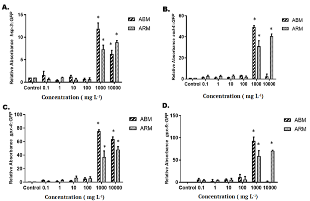 Caenorhabditis elegans N2 Bristol Wild-type strain and transgenic strains with green fluorescent protein (GFP) introduced into genes encoding heat shock protein (hsp-3) and oxidative stress (sod-4, gpx-4, gpx-6), CGC strains owned by the Laboratory of the BIOTOXAM Research Group, were cultivated in Petri dishes at 20°C with NMG, nematode growth medium, (NaCl, agar, peptone, Cholesterol, KCl, CaCl2, MgSO4) and Escherichia coli OP50 as a source of food (Hunt, 2017). To obtain a homogeneous population, nematodes were synchronized by suspension in an alkaline solution composed of 5.25% hypochlorite and NaOH, whose function is to oxidize the organism without destroying the eggs (Tejeda-Benitez & Olivero-Verbel, 2015).