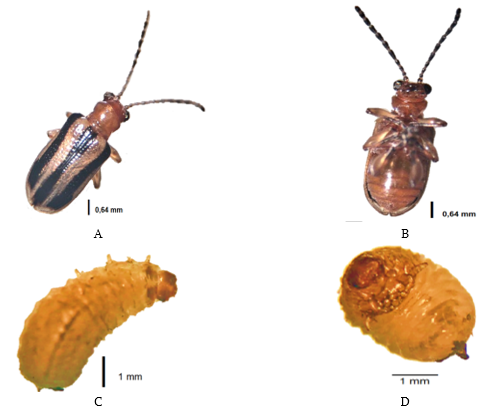 The insect was identified as L. quadrivittata (Coleoptera: Chrysomelidae: Criocerinae). These chysomelids show a hypognathic head that fits partially or almost entirely in the prothorax and relatively short antennas, filiform and gradually thickened from the base to the apex (Figure 1). The legs have anterior globular thighs. The jaws are strong, dark brown, with sharp teeth and jaws with palps made up of three segments. They are relatively small, with length ranging from (0.64 to 1.0 mm).