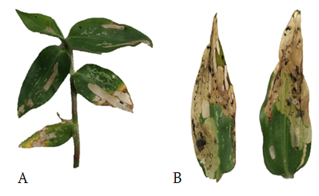 Commelina benghalensis miner was observed from the thirtieth day of the cycle, in the initial phase of expansion of the first four leaves and throughout the development of the plant until its death. As a result of their feeding, the active photosynthetic area of the plant was reduced, as adults consume the leaf blade in a well-distributed way in the leaves in order to present a lacy aspect (Figure 2). The larvae are housed inside the leaf by making an incision in the leaf epidermis to feed on the mesophile.