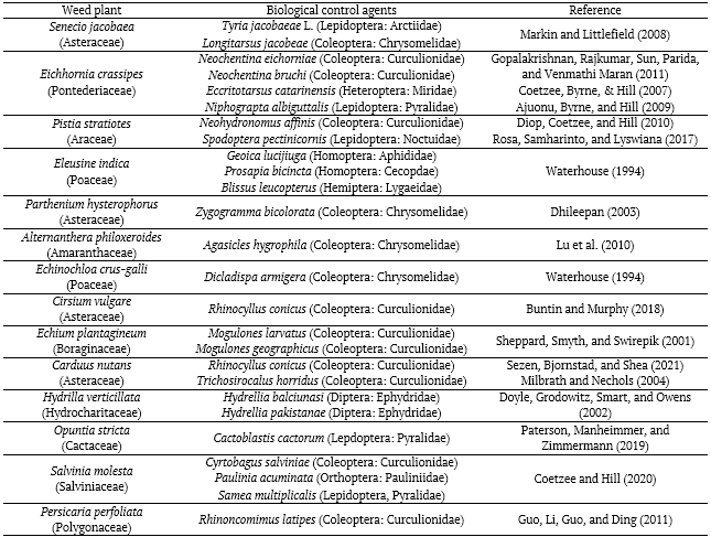 Research with biological control of weed plants has advanced in the search for defoliating and phytophages agents (Table 1).