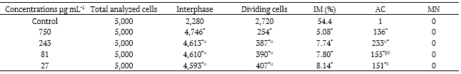 The number of interphase cells for all tested concentrations of R. officinalis L. essential oil was greater than the number observed in the negative control (distilled water), with a consequent decrease in the number of dividing cells (Table 1). The concentration of 750 μg mL-1 showed the highest number of interphase cells, therefore, the lowest number of dividing cells. However, the concentrations of 243, 81 and 27 μg mL-1, despite also showing significant differences in relation to the negative control and the highest concentration tested, did not show statistically significant differences between them. Thus, it is not possible to establish a dose-response curve (dose-dependent effect) of R. officinalis L. essential oil for this parameter.