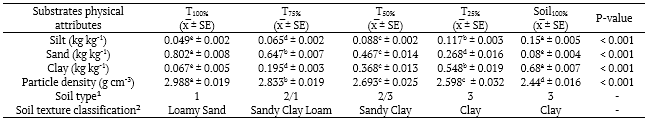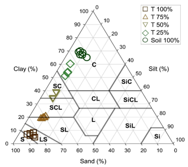 Substrate physical characteristics and soil type varied according to dilution of tailings and classifications were made considering the United States Department of Agriculture (USDA) (Figure 1), MAPA and the Brazilian Society of Soil Science (acronym in Portuguese, SBCS) (Table 1). Comparing the extreme treatments (i.e., Soil100% vs. T100%), the substrate of Soil100% presented three times more silt (0.15 kg kg-1), ten times more clay (0.68 kg kg-1), ten times less sand (0.08 kg kg-1), and smaller particle density (2.44 g cm-3) compared to the substrate of T100% (Table 1). In general, all treatments showed low proportions of silt, while there was a reduction in clay and an increase in sand proportions in treatments with mining tailings (Figure 1).