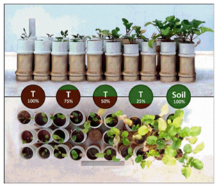The soil affected by mining tailings, here simply referred to as tailings (T), was collected on the margin of the Gualaxo do Norte river (20°15'23.09"S; 43°25'7.06"W) in Antônio Pereira, a district of the municipality of Ouro Preto, Minas Gerais, Brazil. The Gualaxo do Norte river is a tributary of the Doce river. Five treatments were prepared (dilutions in proportion of dry mass) to evaluate the effectiveness of diluting the mining tailings with soil rich in OM (organic soil - Terral®). The organic soil used is non-toxic, sterile, and odorless, free from pests and weeds. It is composed of 50% soil and 50% bovine manure, to improve soil aeration and drainage, thus favoring plant development. Tailings were sifted and homogenized according to the composition of the five treatments: 1) pure tailings (T100%); 2) tailings75% + soil25% (T75%); 3) tailings50% + soil50% (T50%); 4) tailings25% + soil75% (T25%), and 5) pure organic soil (Soil100%). Hence, the treatments were categorized following a progressive dilution of mining tailings in the substrates with organic soil.