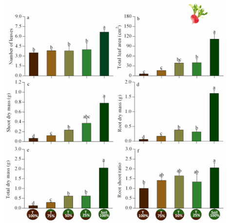 Individual radishes cultivated in the Soil100% treatment had significantly greater shoot dry mass (SDM) than those cultivated in any other treatment, with the exception of T25% (p <0.001; Figure 3c). Specifically, SDM was 1.9 times greater for radishes cultivated in Soil100% than for those cultivated in T25%, 2.5 times greater than in T50%, 4.6 times greater than in T75%, and 8.71 times greater in T100% (p <0.001; Figure 3c). Similarly, root dry mass (RDM) was greatest for radishes in Soil100% (p <0.001, Figure 3d). RDM was 3.9 times greater for individuals in Soil100% than for those in T25%, 3.4 times greater than in T50%, 7.2 times greater than in T75%, and 18.7 times greater than in T100% (p <0.001; Figure 3d). Likewise, R. sativus in Soil100% had the greatest total biomass among treatments, being 2.9 times greater than for plants in T25%, 2.9 times greater than in T50%, 6.2 times greater than in T75%, and 13.7 times greater than in T100% (p <0.001; Figure 3e). Finally, root/shoot biomass ratio only differed between the extreme treatments (Soil100%= 2.06, T100%= 1.01) (p = 0.0497; Figure 3f).