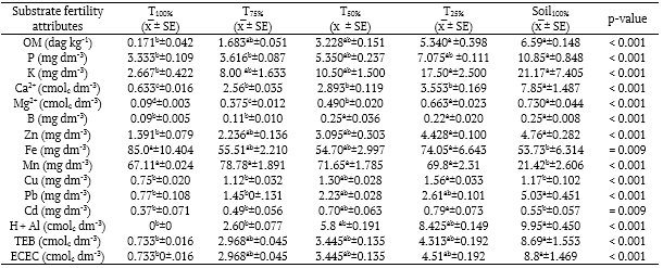 As predicted, the addition of organic soil improved the overall quality of substrates (Table 2). Comparison of the treatments Soil100% vs. T100% revealed that all of the chosen substrate quality parameters differed significantly, with the exception of Cu and Cd contents (Table 2). There was a drastic reduction in OM (38.5 times; p <0.001; Table 2), in macronutrients Ca2+ and Mg2+ (12.4, and 8.1 times lower, respectively; p <0.001; Table 2), and micronutrients B and Zn (2.8, and 3.4 times lower, respectively; p <0.001; Table 2). In addition, the T100% treatment also had 12 times lower ECEC than the Soil100% treatment (p <0.001; Table 2), which indicates severe fertility loss in relation to the ideal condition for crop cultivation. Furthermore, the treatment with minimum dilution (T75%) marginally improved substrate quality by increasing OM, K, Zn, TEB, and ECEC to a point that it did not differ significantly from Soil100%. Similarly, substrate fertility also improved with tailings reduction by half (T50%). Otherwise, there was still 2.7 times less Ca2+ and 1.5 times less Mg2+, 1.02 times more Fe (p <0.009), and 3.3 times more Mn in relation to the Soil100% treatment (p <0.001; Table 1). Finally, even though the T25% treatment had the minimum amount of mining tailings, there was still 1.4 times more Fe (p <0.009), 3.3 times more Mn, and 2.2 times less Ca2+ than for the Soil100% treatment (p <0.001; Table 2).