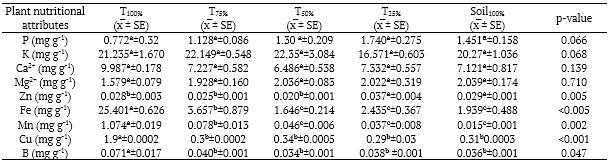 For physical and chemical characterization of the substrates, samples (ca. 500 g) from each pot (n = 6 per treatment; total = 30) were analyzed at the Soil Department at the Universidade Federal de Viçosa. The evaluated physical attributes were proportions of clay (kg kg-1), sand (kg kg-1), and silt (kg kg-1), as well as particle density (Teixeira, Donagemma, Fontana, & Teixeira, 2017). According to the Brazilian Ministry of Agriculture, Livestock and Food Supply (MAPA), soils are classified into three categories regarding water retention capacity: sandy (Type 1); medium texture (Type 2); and clayey (Type 3), as provided in the Normative Instruction n. 2 of October 9th, 2008 (Brasil, 2008). Soil chemical attributes were characterized by the available content of Phosphorus (P), Sodium (Na), Potassium (K), Iron (Fe), Zinc (Zn), Manganese (Mn), Cooper (Cu), Cadmium (Cd), and Lead (Pb) using the Mehlich 1 solution (Teixeira et al., 2017). The exchangeable content of Aluminum (Al3+), Calcium (Ca2+), and Magnesium (Mg2+) were extracted using a 1.0 mol L-1 solution of potassium chloride (KCl). Hot water was used for Boron (B) extraction. Determination of H+Al used a 0.5 mol L-1 calcium acetate solution at pH 7.0. From these data, total exchangeable bases (TEB) and effective cation exchange capacity (ECEC) were calculated. In addition, OM was determined using the Walkley-Black method (Teixeira et al., 2017).