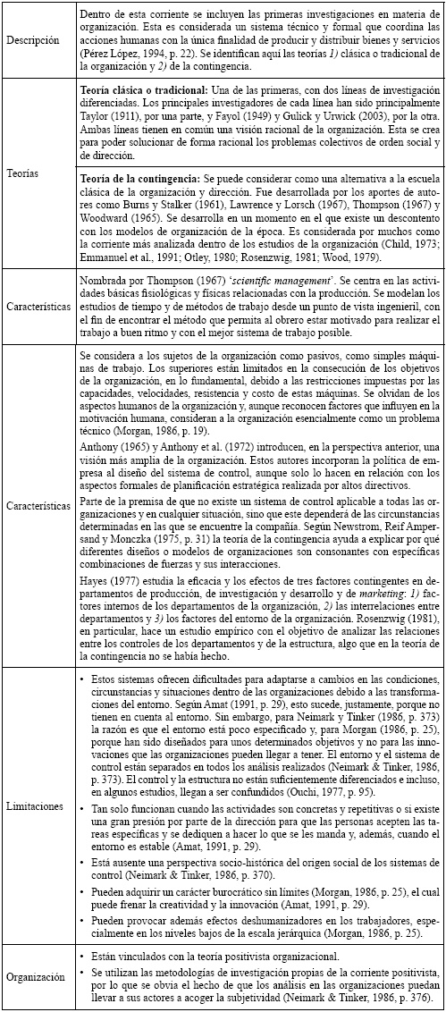 A pesar de la variedad de contribuciones realizadas acerca del tema, es posible identificar tres grandes enfoques: 1) sistemas mecanicistas y formales de control, 2) sistemas de control centrados en aspectos psicosociales y 3) sistemas de control enfocados en aspectos culturales y antropológicos. Estos se muestran de manera sintética en las tablas 1, 2 y 3, respectivamente.
