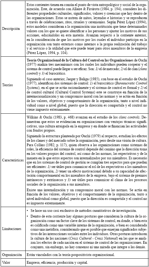 El tercer enfoque, propio de los sistemas de control centrados en los aspectos culturales y antropológicos de la organización, es muy amplio en sus investigaciones. Por un lado, analiza asuntos como la manera de diseñar un sistema de control eficiente, teniendo en cuenta los diferentes efectos y relaciones de la cultura de la organización y de sus miembros (Collins, 1982; Fisher, 1995; Kerr & Slocum, 1987; Ouchi, 1979), esto considerando la cultura como una variable interna de la organización (Flamholtz, Das, & Tsui, 1985; Flamhotz, 1983; Inzerilli & Rosen, 1983; Jaeger & Baliga, 1985; Schein, 1984; Wilkins & Ouchi, 1983; Young, 1979); por el otro, se analizan los efectos de la cultura en los sistemas de control cuando esta es considerada una metáfora (Allaire & Firsirotu, 1984; Cooper, Hayes, & Wolf, 1981; Langfield Smith, 1995; Pondy & Mitroff, 1979; Schein, 1992; Smircich, 1983). Así pues, según este enfoque, para que un sistema de control sea eficiente, de acuerdo con Ouchi (1979, p. 846), tiene que estar equilibrado entre cómo evaluar los resultados de los individuos de la organización y cómo conseguir su cooperación para alcanzar los resultados.