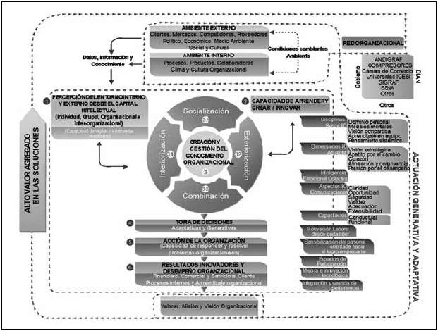 También se consideran la capacidad de aprender y crear/innovar, la acción de la organización (capacidad de resolver problemas o eficiencia, capacidad de responder o eficacia), percepción del entorno interno y externo (procesos y productos, colaboradores, cultura y clima organizacional, mercados, competidores, proveedores, gobierno, situación económica y social, medio ambiente, cultura del país y red organizacional), toma de decisiones (adaptativas, generativas), desempeño organizacional y resultados innovadores (financiero, comercial y en el servicio al cliente, procesos internos, aprendizaje y crecimiento organizacional), sensibilización del personal; motivación laboral desde los líderes, espacios de participación, y mejora e innovación tecnológica. Otros elementos, que por su elevada importancia fueron incorporados también en el modelo de gestión fueron los valores, la misión y visión organizacional, así como las declaraciones de dirección y el alto valor agregado en las soluciones (ver figura 1).