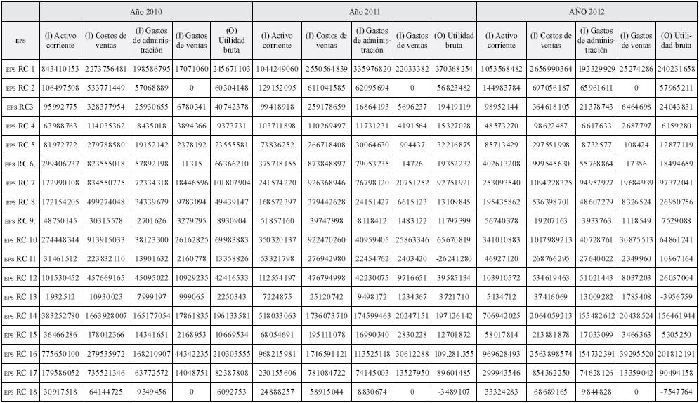 En este caso, en particular las variables seleccionadas para evaluar las EPS son las entradas: activo corriente, costos de venta, gastos de administración y gastos de ventas; por su parte, la salida es utilidad bruta. Los valores de estas variables se muestran en la tabla 1.