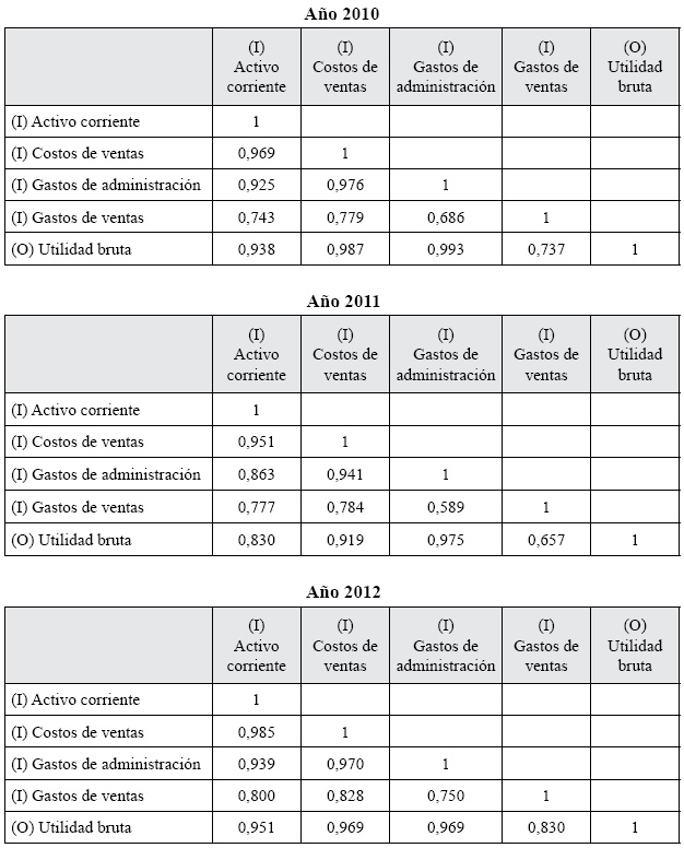 Se determinó la correlación entre las variables de entrada y salida, observándose que existe una alta correlación positiva. Por esta razón, un aumento en los recursos se evidenciará como un aumento en los productos, esta correlación se muestra a continuación: