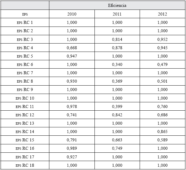 En la tabla 3 se presentan los resultados resumidos de los índices de eficiencia del modelo DEA-BCC para cada uno de los años de estudio. La eficiencia promedio es de 94,2, 83,4 y 87,6 %, respectivamente. La misma tendencia se observa en las EPS RC 8 y RC 6, que resultaron ser las menos eficientes durante este periodo.