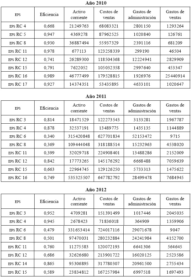 Los resultados de la tabla 4 muestran que, si todas las EPS consideradas en el análisis se desempeñan como entidades eficientes durante los años 2010 y 2011, los costos de ventas y gastos de ventas son las variables en donde se presentó mayor “desperdicio” en las EPS evaluadas, mientras que en el año 2012 son las variables costos de ventas y gastos de administración las que dan cuenta de esto.