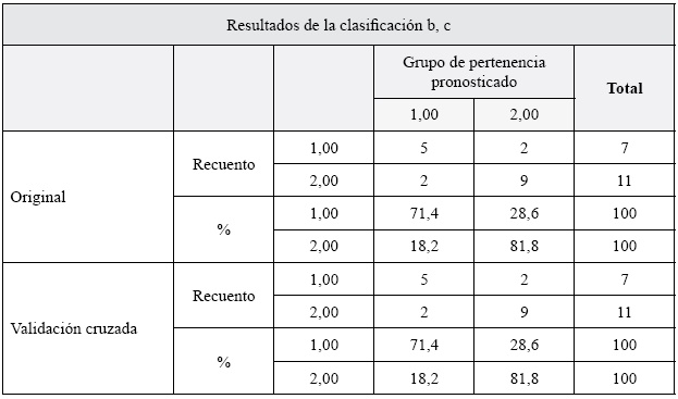 Se realizó una clasificación de las EPS del sector, durante el periodo de estudio, mediante la técnica de análisis discriminante. Utilizando como variable de agrupación la eficiencia de las mismas (Grupo 1: las EPS con eficiencia igual a 1 y Grupo 2: las EPS con eficiencia menor a 1) se logró una clasificación correcta del 78% de los datos agrupados, tal como se observa en la tabla 5. Esta es una forma de validar los resultados obtenidos con la DEA.