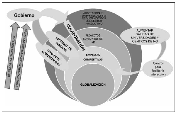 Los dirigentes de economías industrializadas y de algunas emergentes, a través de sus organizaciones gubernamentales e instancias relacionadas con la ciencia y la tecnología, han estado concentrados en fomentar la interacción entre la ciencia y la industria (Martínez & Fundación IKERTIA, 2007), así como en diseñar políticas destinadas a aumentar la calidad de los centros de investigación pública y de las instituciones educativas (Etzkowitz, 2008). Esto con el fin de desarrollar un mejor y más productivo emprendimiento y generar así mayores beneficios para el desarrollo nacional (Carayannis & Campbell, 2012; Nowotny, Scott, & Gibbons, 2001). Se busca además incrementar la capacidad de estas instituciones para apoyar de manera más decidida y efectiva a las empresas, para que estas, en la medida de lo posible, lleguen a realizar actividades tecnológicas más dinámicas, avanzadas y que representen un mayor valor agregado (Bodas Freitas, Argou, & Mirra de Paula, 2013).