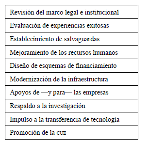 Por lo anterior, resulta determinante la articulación de los tres actores aludidos: empresas, universidades y gobierno, pero, en particular, que este último considere los elementos esenciales que permitan fortalecer la CUE (ver tabla), entre otros, la revisión del marco legal e institucional. En este sentido, y tomando en cuenta la experiencia exitosa de otros países, se puede concluir que la colaboración universidad-empresa no debe ser solo una prioridad para los gobiernos, sino también una obligación, razón por la cual es preciso que los investigadores profundicen aún más en el establecimiento, el contenido, la organización y la gestión de la mencionada colaboración, para identificar las mejores prácticas posibles en esta materia.