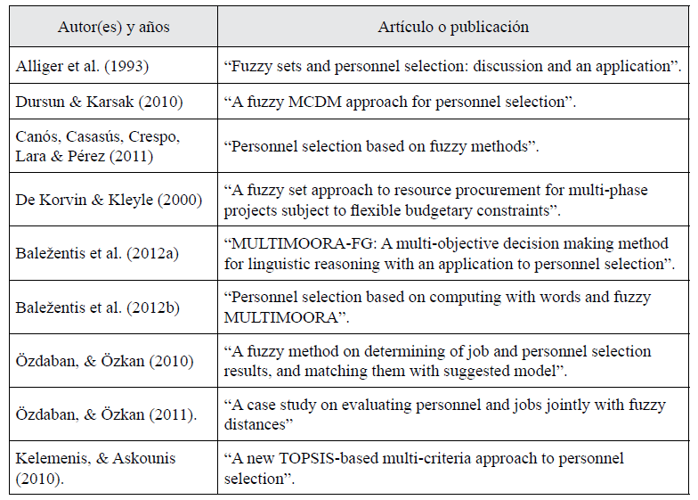 De los artículos encontrados y revisados se hizo una selección rigurosa para decantar los verdaderamente más relevantes para su presentación. Estos se relacionan en tabla 2. Ellos, en efecto, por una parte hacen referencia a la lógica difusa de manera central y, por la otra, consideran aplicaciones de la lógica difusa, específicamente, al proceso de selección de personal. Algunos de los artículos que aparecen en la búsqueda se refieren al analytic hierarchy process (Saaty, 1977), sin embargo, no es objeto del presente artículo explicarlo.