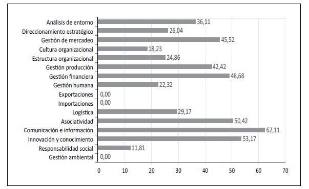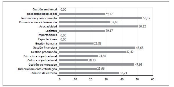 Los principales componentes susceptibles de mejora, es decir, aquellos que han resultado con una calificación muy baja, son la responsabilidad social, la cultura organizacional, la gestión humana, la estructura organizacional y el direccionamiento estratégico.