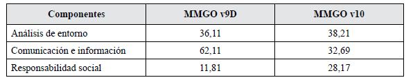 Aunque luego de la aplicación de las dos versiones del MMGO en la misma organización, en el mismo tiempo y con la misma información se obtuvieron resultados numéricos similares, la calidad de los datos obtenidos con la versión 9D fue mejor que aquella lograda con la implementación de la versión 10, pues a pesar de que la cantidad de variables en el componente es similar, el enfoque cambia bastante.