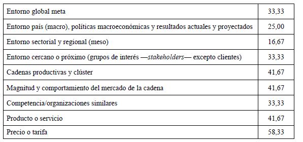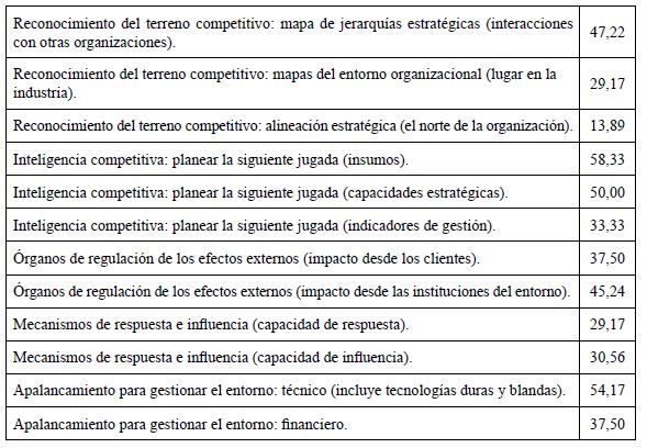 En la versión 10, este componente propone cinco variables principales que cubren aspectos susceptibles de afectar directa o colateralmente a la organización desde la función gerencial (tabla 2). Estos cinco factores son: 1) reconocimiento del terreno competitivo; 2) inteligencia competitiva; 3) órganos de regulación de los efectos externos; 4) mecanismos de respuesta e influencia, y 5) apalancamiento para gestionar el entorno (G3Pymes, 2013).