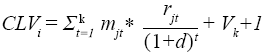 El CLV del cliente i al tiempo t se genera por la sumatoria de los k períodos que se aprecia una actividad comercial con el cliente, multiplicado por la probabilidad de que el cliente deje ganancias al momento t (rjt), sobre la matemática del valor presente neto que implica la tasa de descuento mensual d que indica la depreciación del dinero en el tiempo, también conocido como riesgo ajustado a costo de capital, más un término de error o residualidad v a perpetuidad.
