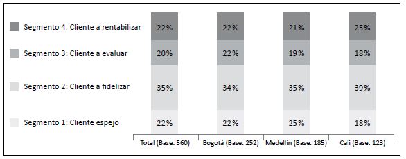 Si el entrevistado reportaba no haber siniestrado la póliza, no usar con frecuencia las coberturas y no tener intención de cambiar de asegurador, quedaba clasificado en el segmento 1 del modelo táctico de segmentación expuesto con anterioridad (figura 1). Si manifestaba tener intención de cambiar de firma aseguradora, pero su perfil de uso de coberturas y siniestralidad era bajo, quedaba clasificado en el segmento 2. Ahora bien, si expresaba tener planes de cambio de asegurador, más perfil de siniestralidad y uso de coberturas elevado, quedaba clasificado en el segmento 3. De lo contrario, se clasificaba en el segmento 4.