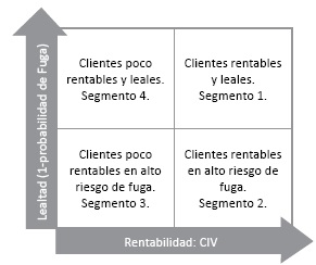 Como parte del proceso investigativo de la firma Sinnetic1, en materia de CRM analítico, se ha planteado un modelo que unifica métricas eficientes de fuga de clientes y valor vitalicio de los mismos, en un esquema conjunto para diseñar planes de retención y rentabilización eficientes. A este modelo se le ha llamado “modelo promocional cruzado para sector servicios” (Sinnetic, 2012), el cual plantea, en primer lugar, usar la métrica de fuga de clientes como indicador de lealtad: 1-fuga en el eje Y de un plano cartesiano y el valor vitalicio del cliente como una métrica eficiente de rentabilidad en el eje X. Este plano muestra un modelo de segmentación táctica de clientes que se representa en la figura 1.